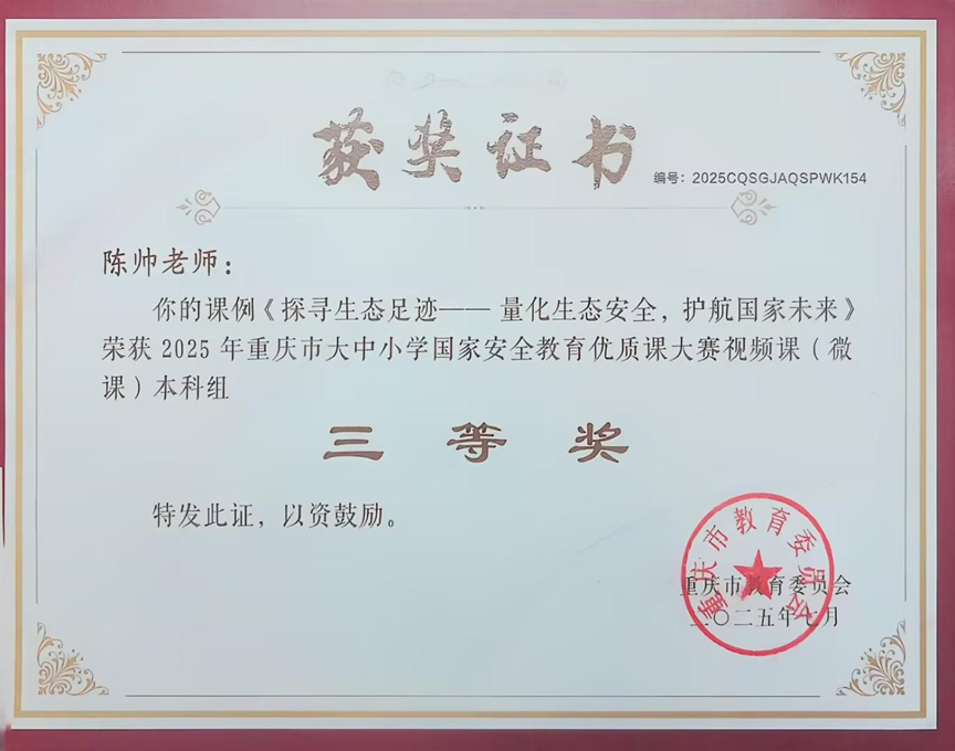 17318484270 2025年重庆市大中小学国家安全教育优质课大赛为重庆市教委首次举办,我院土地资源管理系教师陈帅的作品“探寻生态足迹——量化生态安全,护航国家未来”从全市高校百余位参赛教师中脱颖而出,斩获本科组视频课(微课)三等奖。