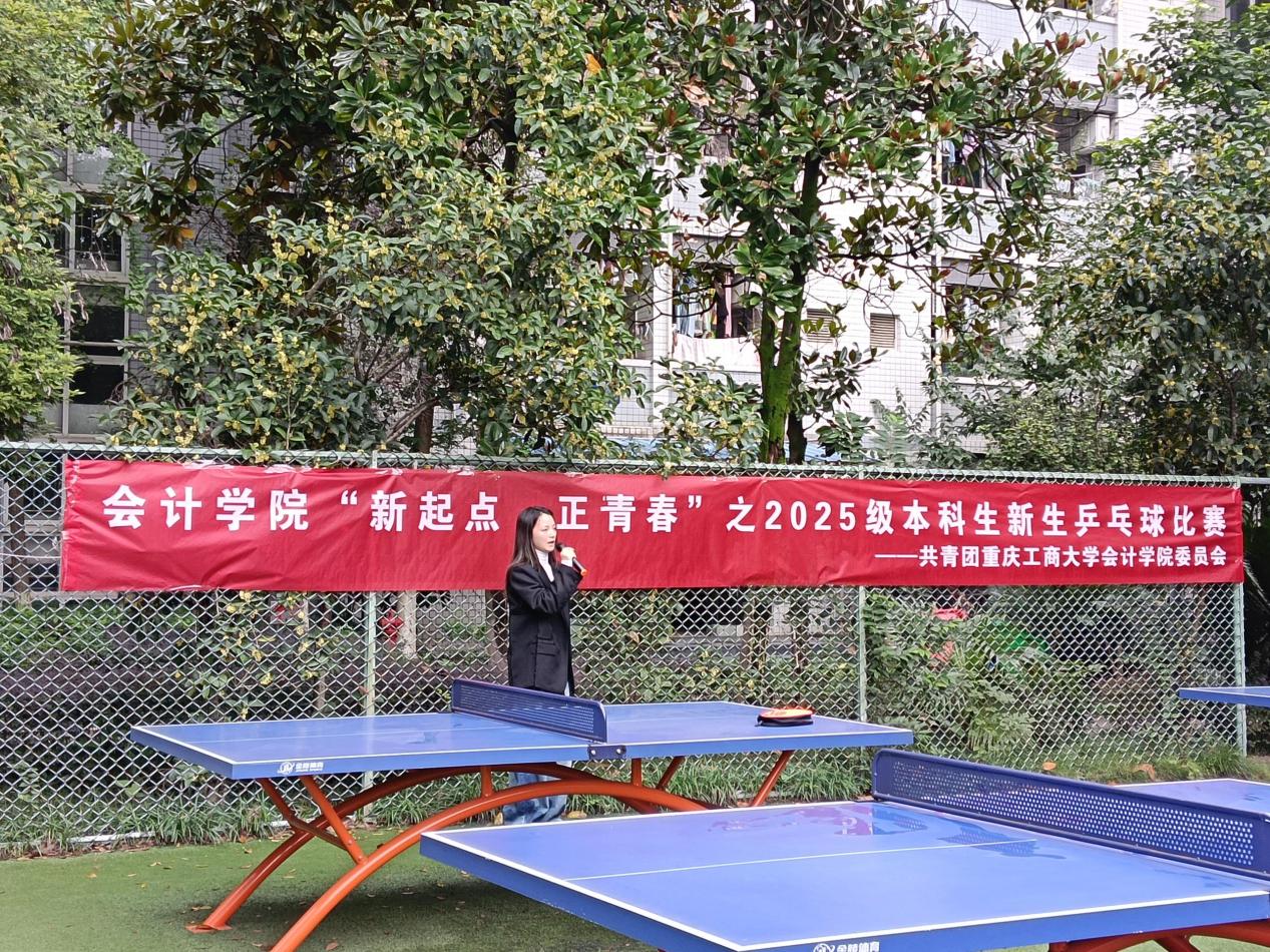 17318484270 10月26日上午,重庆工商大学会计学院“新起点·正青春”2025级新生乒乓球比赛在兰花湖校区室外乒乓球场地成功举办。此次比赛由共青团重庆工商大学委员会主办、会计学院分团委学生会与搏燃体育协会联合承办,共26名选手参与此次比赛及多名学生观众共同参与活动。乒乓球比赛启动前,会计学院李芋蓉老师为选手们做动员,让大家以训练时的状态投入赛场,自信发挥。