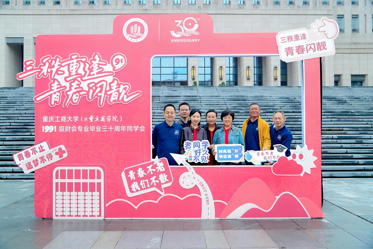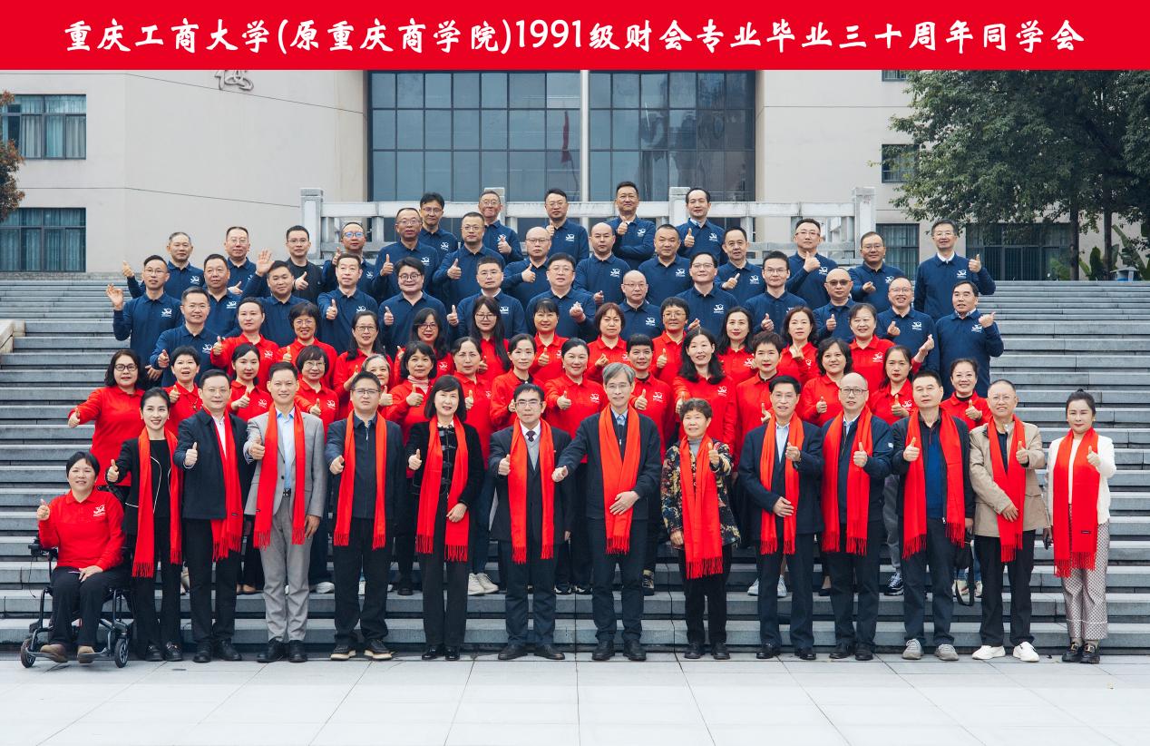 17318484270 金秋的校园,丹桂飘香,风和日丽。10月25日,会计学院曾荣获“全国先进班集体标兵”称号的1991级财会专业学子毕业30周年秩年返校活动在南岸校区成功举行。阔别三十载的校友们从祖国的四面八方重聚校园,共忆青春岁月,共叙师生情谊,共话母校发展。重庆工商大学党委常委、副校长田双全,原重庆工商大学校长孙芳城,原重庆工商大学副校长陈兴述,重庆财经职业学院党委书记罗勇,学校校友办公室主任郭敏,会计学院党委书记邓德敏,会计学院院长钟廷勇,学校校友办公室副主任顾飞,原1991级财会专业辅导员杨志君,曾经的任课教师代表章新蓉、李定清、莫云以及1991级财会专业60余名校友等参加有关活动。