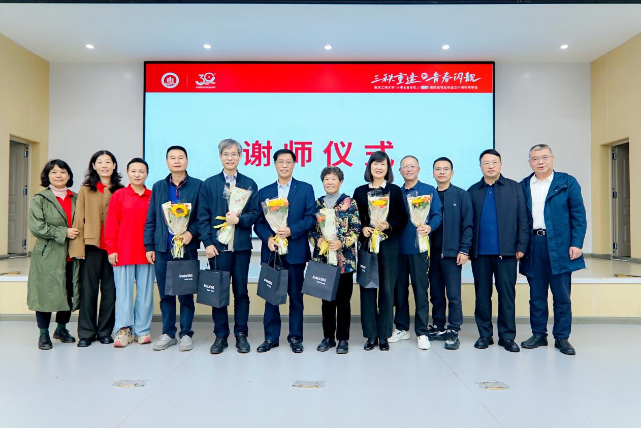 校友代表向当年授课教师代表赠送鲜花及纪念品以表达感恩之情。