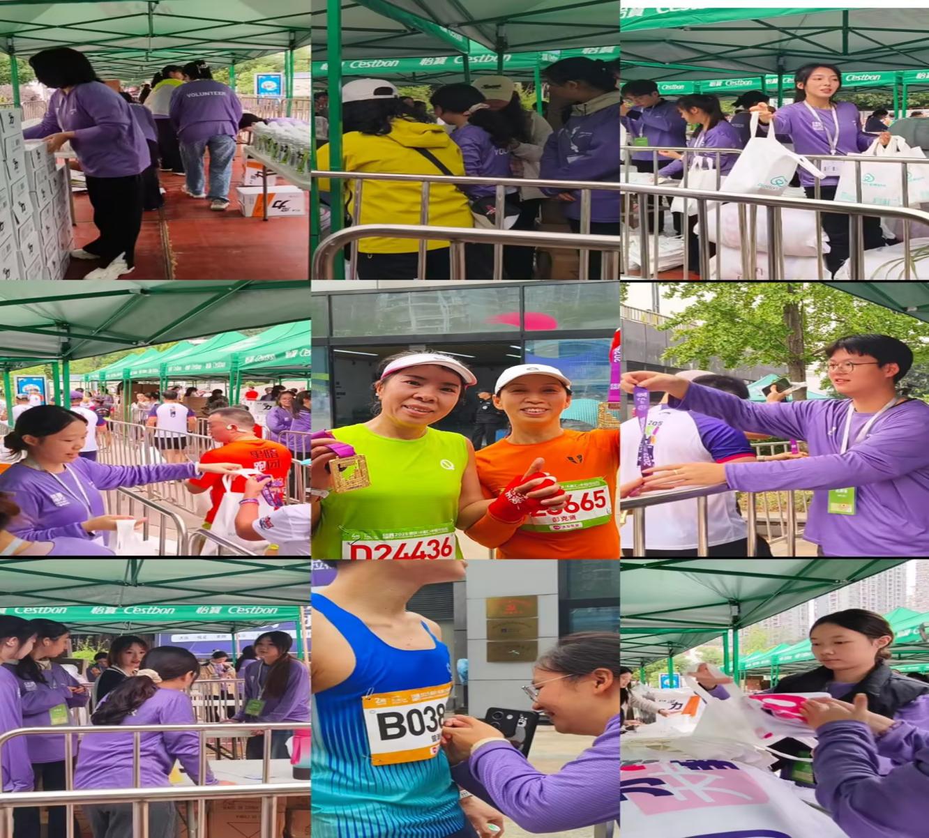 随后,志愿者们奔赴各自的岗位,志愿者们在完赛物资发放区,紧张而有序地进行着准备工作。志愿者们分工明确,有负责为陆续抵达终点的选手在号码布上面打勾的,有的负责挂上象征荣誉的完赛奖牌,并递上温暖的毛巾和完赛包的,也有发放饮料、面包和香蕉等补给物资给完赛选手的。