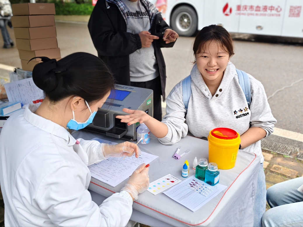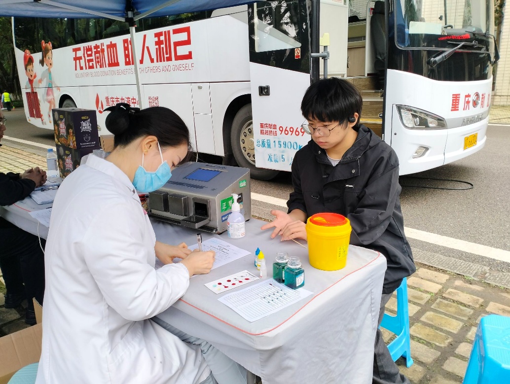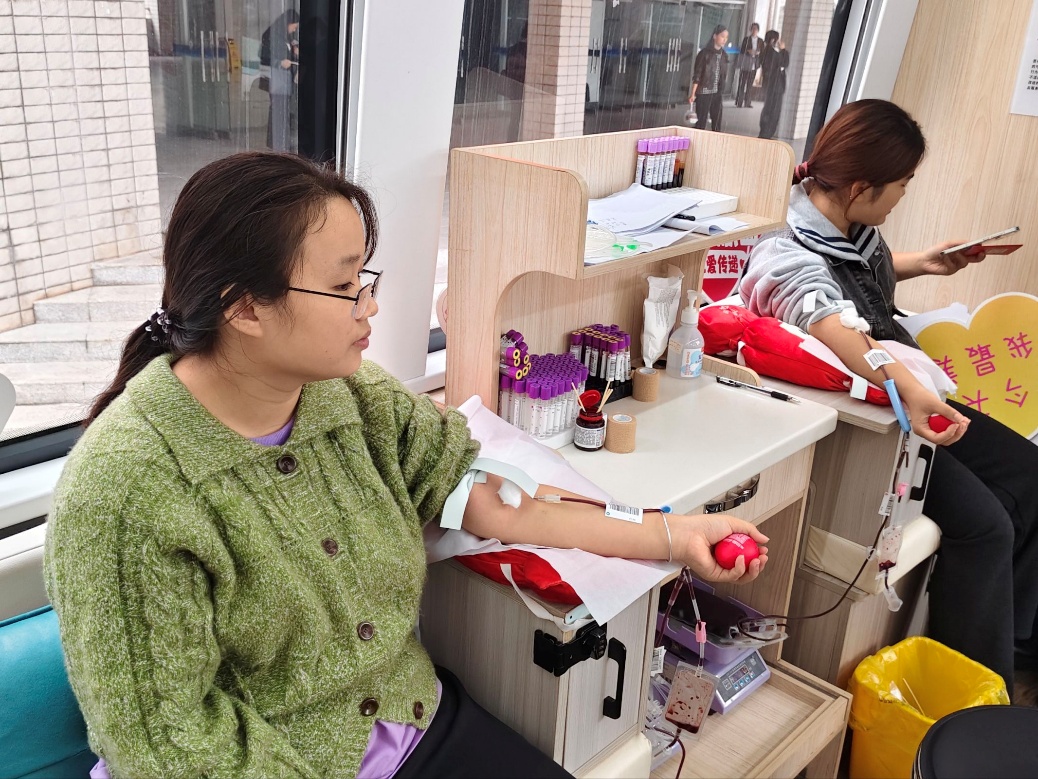 信息表填写完毕,志愿者便陪同师生前往采血检验区,指尖刺破的微麻与“能帮到别人”的热忱相比,显得格外轻微。检验过程中,志愿者始终站在一旁,用“很快就好”“放松就没事”的话语安抚紧张情绪;待检验结果显示合格,又小心翼翼引导师生登上献血车,还不忘叮嘱“上车后有任何不适及时说”。献血车内,专业医护人员娴熟操作,师生们或闭目轻靠,或与医护人员轻声交谈,窗外是志愿者守望的目光,车内是爱心流淌的温暖,一血一髓间,正为远方的病患编织着生命的希望。