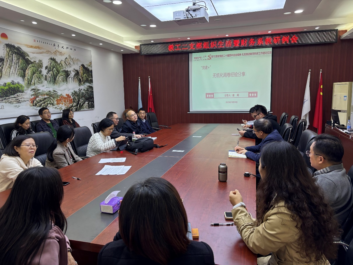 在“党建+”专题环节,学院督导、课程组负责人崔飙做了“无纸化阅卷经验分享”。崔飙教授结合课程实践案例,详细介绍了无纸化阅卷的操作流程、技术优势及质量把控要点,无纸化阅卷不仅契合绿色低碳发展理念,更能通过大数据分析实现对学生答题情况的精准画像,为教学重难点优化、个性化辅导提供数据支撑。他从阅卷系统选型、试题命制规范、评分标准制定、异常情况处理等方面进行了细致讲解,并分享了在《中级财务会计》《财务管理》等课程中推行无纸化阅卷的实践成效,为全院课程教学改革提供了可复制、可推广的经验。