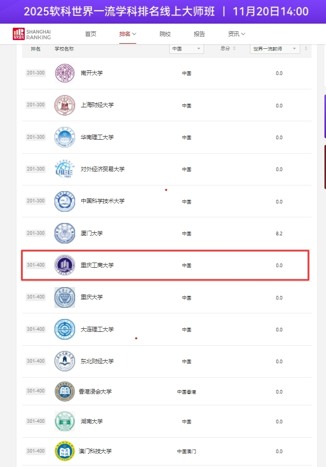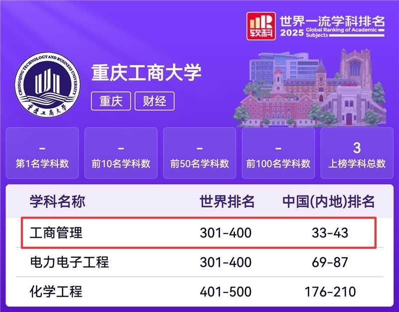 17318484270 11月18日,中国软科正式发布2025“软科世界一流学科排名”,我院工商管理学科再度跻身全球前400强,在内地高校中位列33-43名,标志着我院在该学科领域的整体实力得到了权威认可和持续提升。