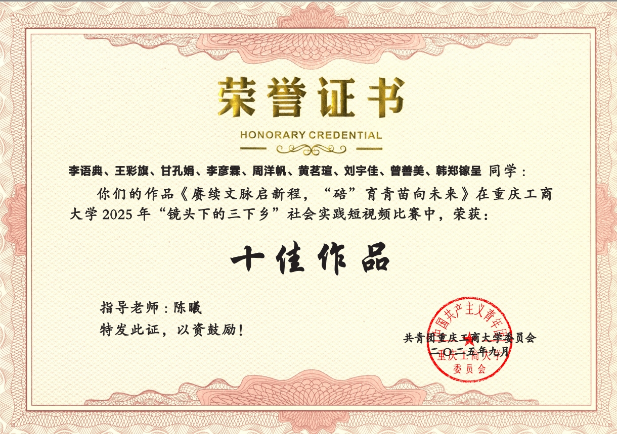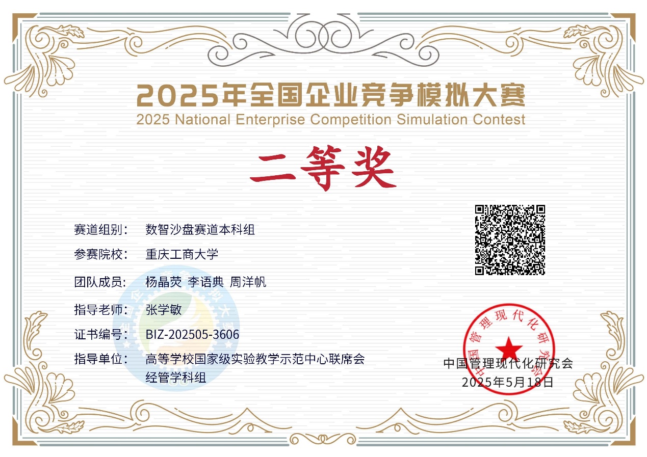 她在学科竞赛的赛场屡创佳绩,斩获了2025年全国企业竞争模拟大赛二等奖等国家级奖项和2025年第三届重庆市大学生商科创新能力大赛金融大数据赛道三等奖等省部级奖项。同时深耕专业知识,以扎实的学术功底为竞赛赋能,实现了实践突破和理论学习的双向奔赴。
