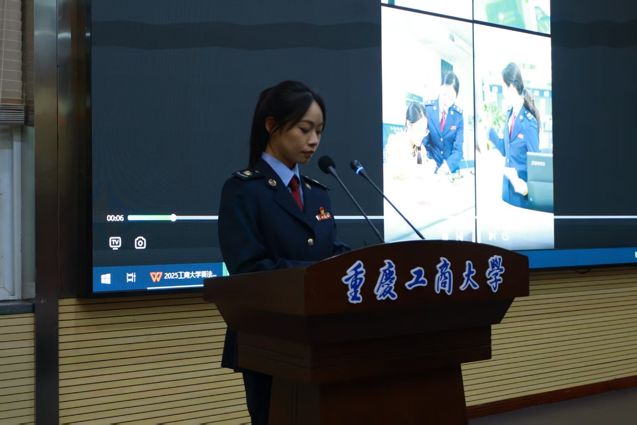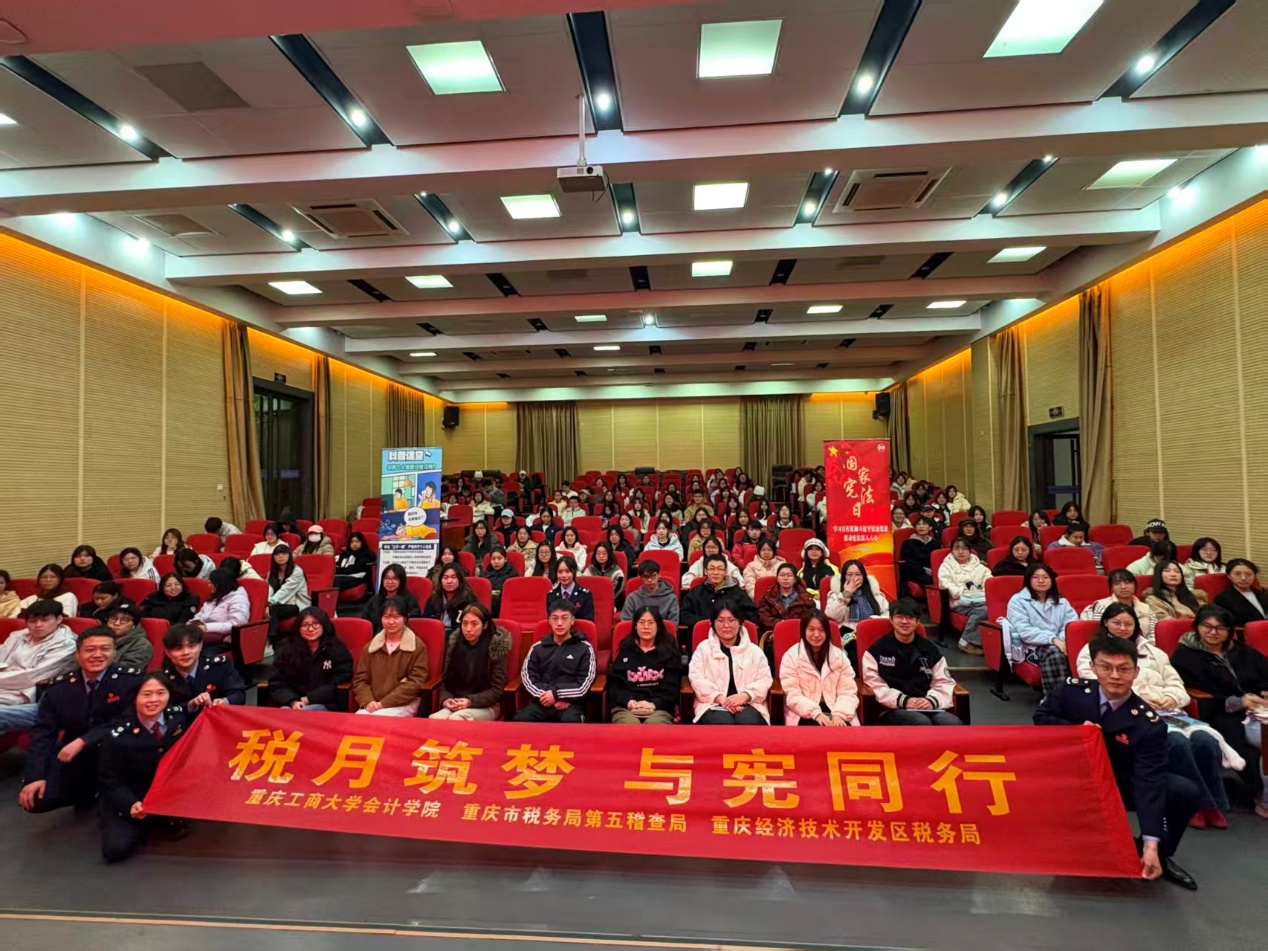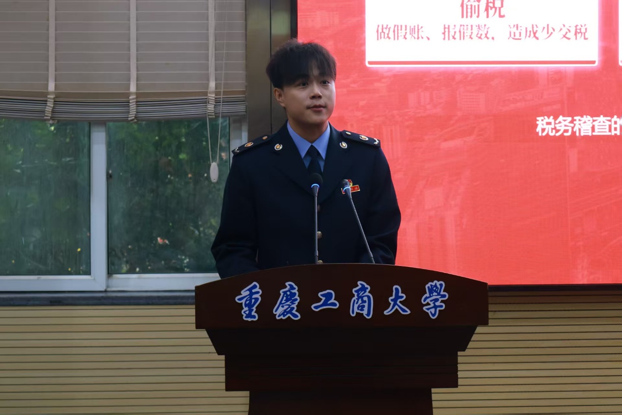 17318484270 为了增强税收法治意识,向同学们普及税法知识,12月4日下午,“税月筑梦,与宪同行”税收宣传主题讲座于兰花湖报告厅顺利举行。本次活动由重庆工商大学会计学院、重庆市税务局第五稽查局、重庆经济技术开发区税务局联合主办,由经开区税务局曹蓝予和第五稽查局姚郅言担任主讲。会计学院2025级200余名学生参加。讲座由会计学院2025级CIMA班杨宏博同学主持。