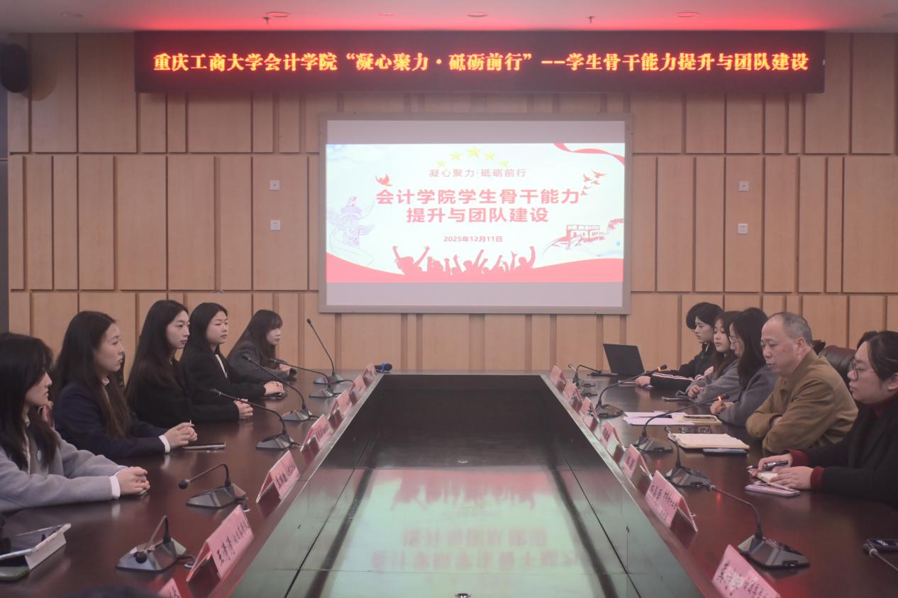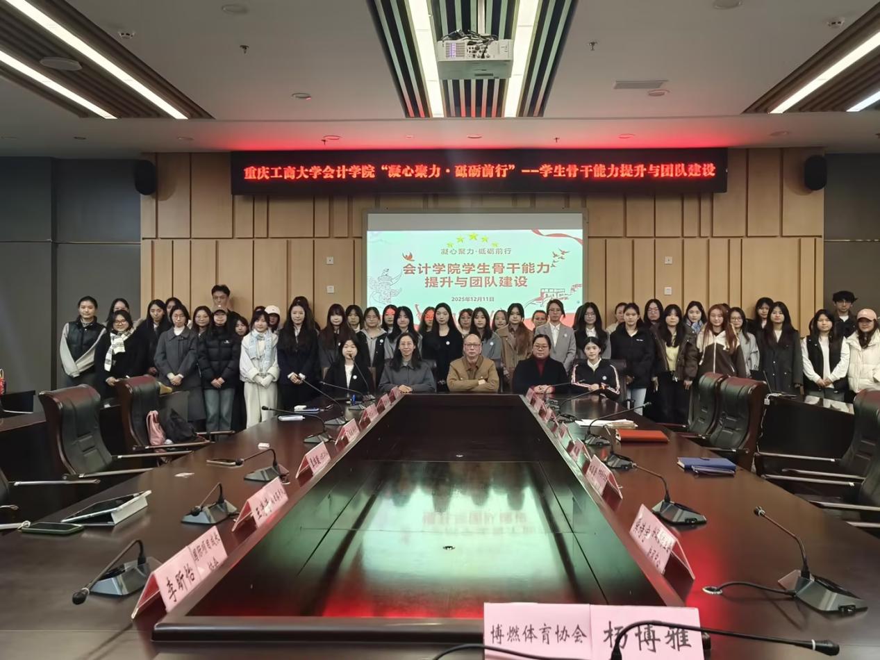17318484270 为深入学习贯彻党的二十届四中全会精神,强化学生骨干队伍建设,提升团队协作能力与综合素质,2025年12月11日下午14:30,会计学院在图书馆第五会议室开展了"凝心聚力,砥砺前行"——学生骨干能力提升与团队建设活动。会计学院党委书记邓德敏、副书记郝颖、会计学院辅导员郑志欣老师以及60余名学生骨干参加了此次活动。