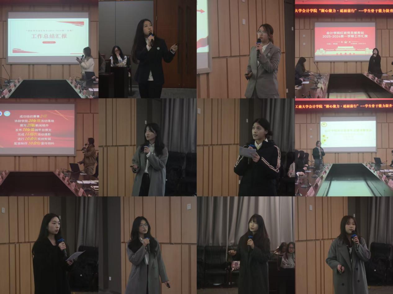 宣讲结束后,“砥砺前行·骨干风采”学生骨干述职环节随即开始。会计学院分团委学生会、各学生组织骨干依次进行述职,围绕思想引领、活动组织、学风建设、权益服务等重点工作,全面汇报近期履职成效,直面工作短板并清晰规划了未来发展方向。