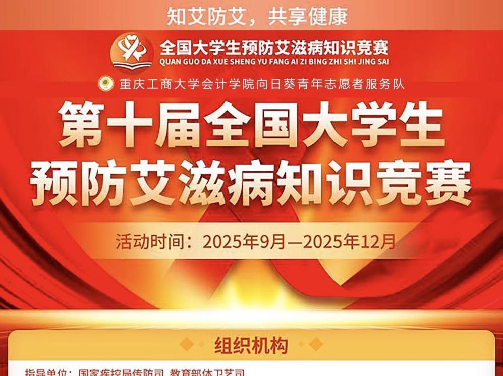 17318484270 为提升全校师生对艾滋病的科学认知与防范能力,筑牢自我保护防线,消除歧视偏见,营造和谐包容的校园氛围,11月3日,由重庆工商大学会计学院向日葵青年志愿者服务队主办的第十八届“红岩铸魂·筑梦启航”志愿文化节系列活动之“知艾防艾,共享健康”线上防艾知识竞赛正式启动。活动面向全校师生开放,将持续至12月15日。