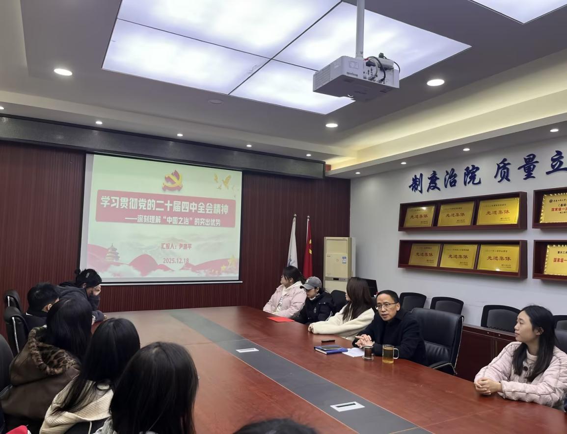 17318484270 为深入学习贯彻党的二十届四中全会精神,引导青年党员深刻理解“中国之治”的突出优势,筑牢理想信念根基,2025年12月18日中午12点30分,重庆工商大学会计学院学生第一党支部在明德楼2019会议室举办学院领导联系支部专题宣讲会。会计学院专职组织员尹建平同志以“深刻理解‘中国之治’的突出优势”为核心,结合国家“两张网”建设实践,为会计学院学生第一党支部全体党员带来了一场内涵丰富、催人奋进的宣讲。