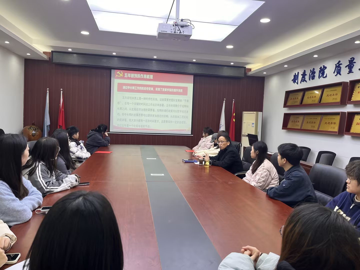 宣讲会上,尹建平同志围绕“中国之治”的突出优势展开,重点解读了五年规划这一重要治理经验。从1953年至今,我国已连续编制实施14个五年规划,即将启动“十五五”规划,在经济发展、资源配置、民生改善等方面创造了举世瞩目的成就。尹建平同志深入剖析了五年规划的作用机理,从阶段性安排的循序渐进、规划理念的持续更新,到指标体系的精准指引、任务布局的战略导向,再到重大举措的资源聚合、重大工程的落地见效,以及问计于民的集思广益、规划体系的上下贯通,全方位展现了中国特色治理模式的科学性与优越性。