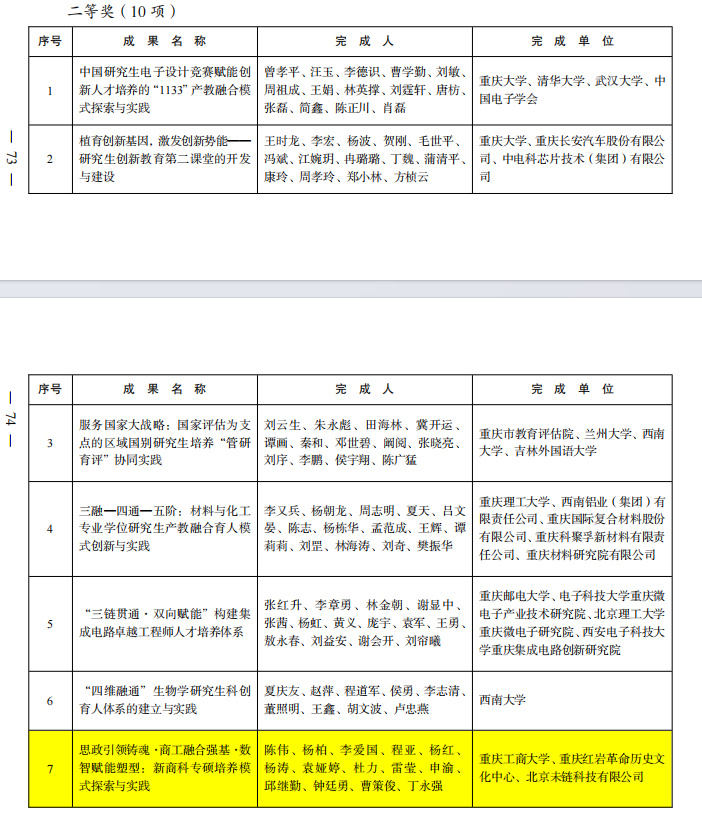 17318484270 近日,重庆市人民政府发布了《关于2025年重庆市教学成果奖励的决定》(渝府发〔2025〕17号),学院院长、MBA教育中心主任陈伟教授团队主持的《思政引领铸魂·商工融合强基·数智赋能塑型:新商科专硕培养模式探索与实践》成果荣获2025年高等教育(研究生)重庆市教学成果奖二等奖。