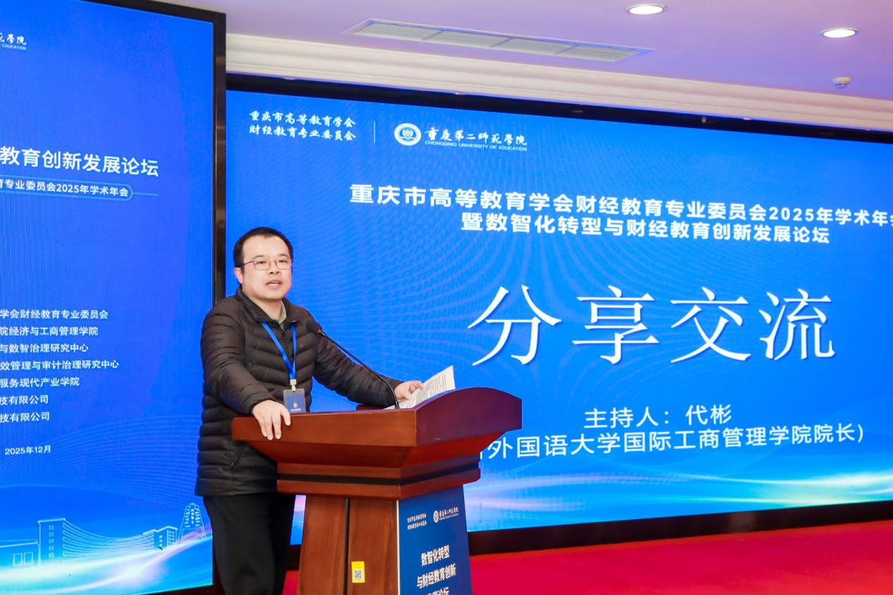 分享交流环节由四川外国语大学国际工商管理学院院长代彬教授主持。全国模范教师、重庆理工大学陈旭教授,重庆第二师范学院袁柏乔副教授,国家黄炎培职业教育奖杰出教师奖获得者、重庆财经职业学院陈祥碧教授以及国家教学成果奖获得者、沈阳跃客教育科技有限公司付伟总经理分别以《技术赋能,提升“查、算、审、溯”四大核心会计数据处理能力》《〈商业模式教程〉:从开发到创新的蜕变之旅》《人机协同,靶向解难——数智赋能下的精准教学实践》《基于财务智能体的财会审综合实践课程设计与开发》为题,分享了他们近年来在教学内容创新、课程资源建设、教学模式改革、产教融合实践等方面的经验和成果。