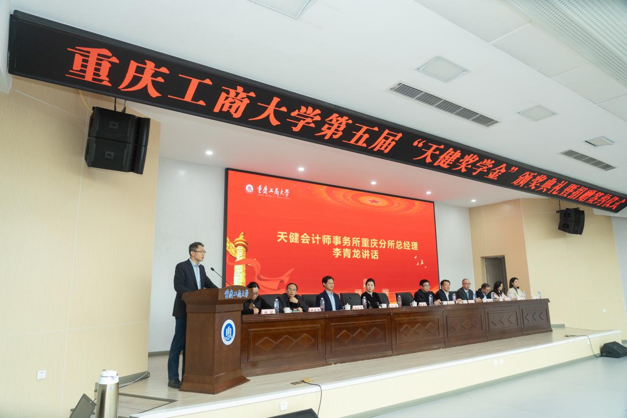李青龙代表天健事务所讲话。他对获奖学生取得的优异成绩表示热烈祝贺,充分肯定了天健与重庆工商大学会计学院的人才培养质量和办学成果,并表示愿意与学校学院继续开展深度合作,共同培育高素质财会人才。他对同学们提出三点希望,第一要深耕专业,拓展视野;第二要持续学习,保持好奇;第三要德才兼修,知行并进。他表示,天健会计师事务所将以此次捐赠协议的签订为契机,持续深化与学院的全方位合作,搭建集实习、就业、培训于一体的广阔发展平台,助力学校培养更多适应行业需求的高素质会计专业人才。