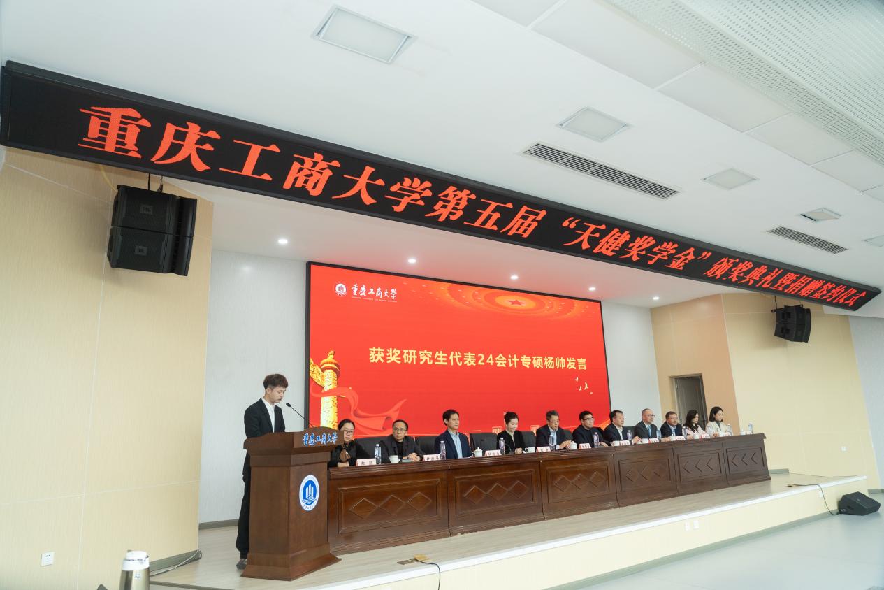 在颁奖环节,会计学院院长钟廷勇宣读天健奖学金表彰决定,与会领导及嘉宾为获奖学生颁发荣誉证书与奖学金。获奖本科学生代表、23CIMA班刘丁睿,获奖研究生代表、24会计专硕班杨帅先后登台发言,向学校的悉心栽培和天健所的鼎力支持表达了由衷的感恩之情。