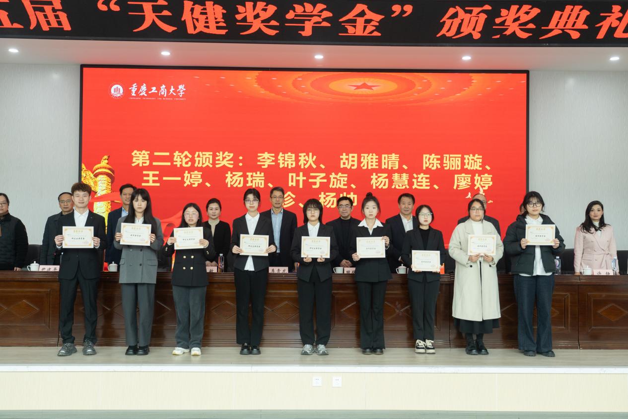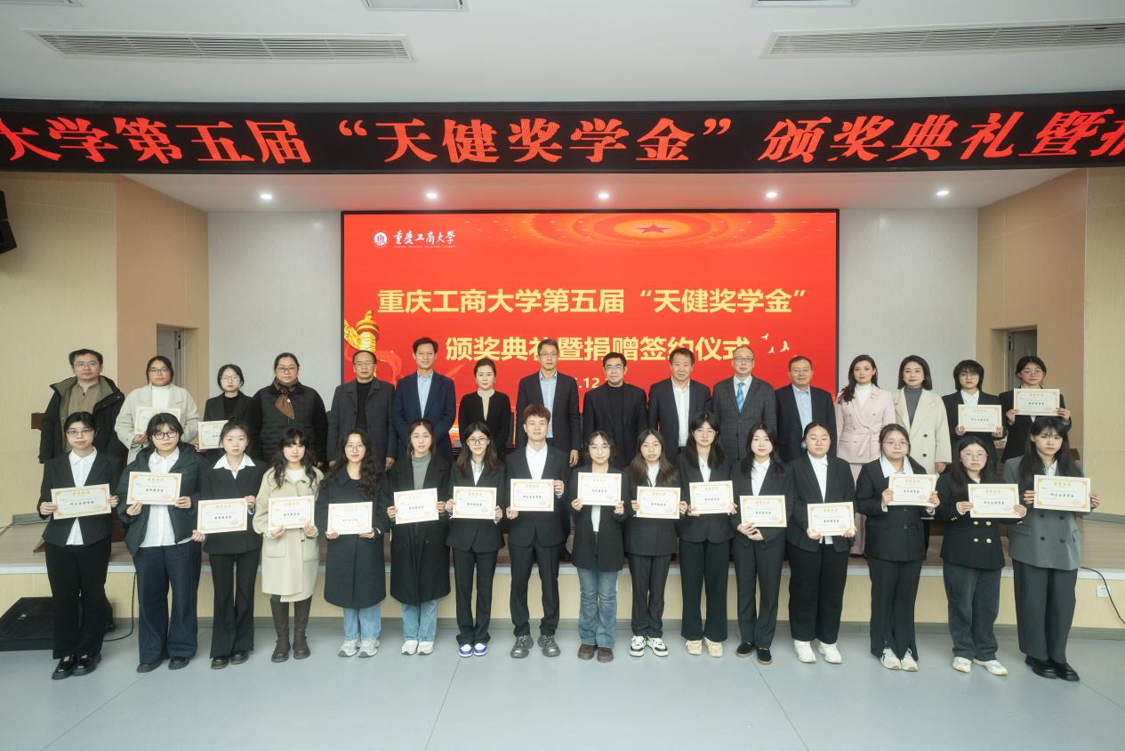 最后,全体参会人员共同合影留念,定格下这一满载荣誉与希望的时刻,重庆工商大学第五届“天健奖学金”颁奖典礼暨捐赠签约仪式圆满落幕。