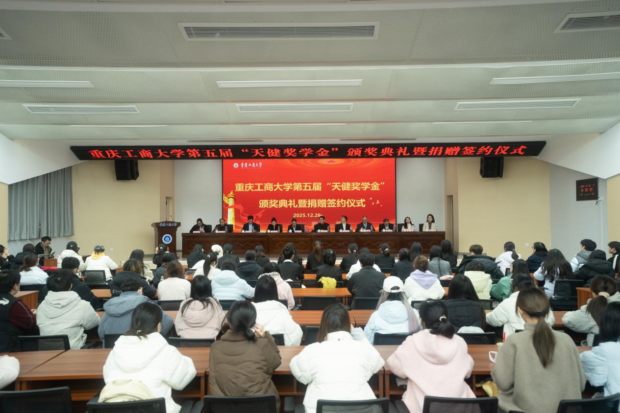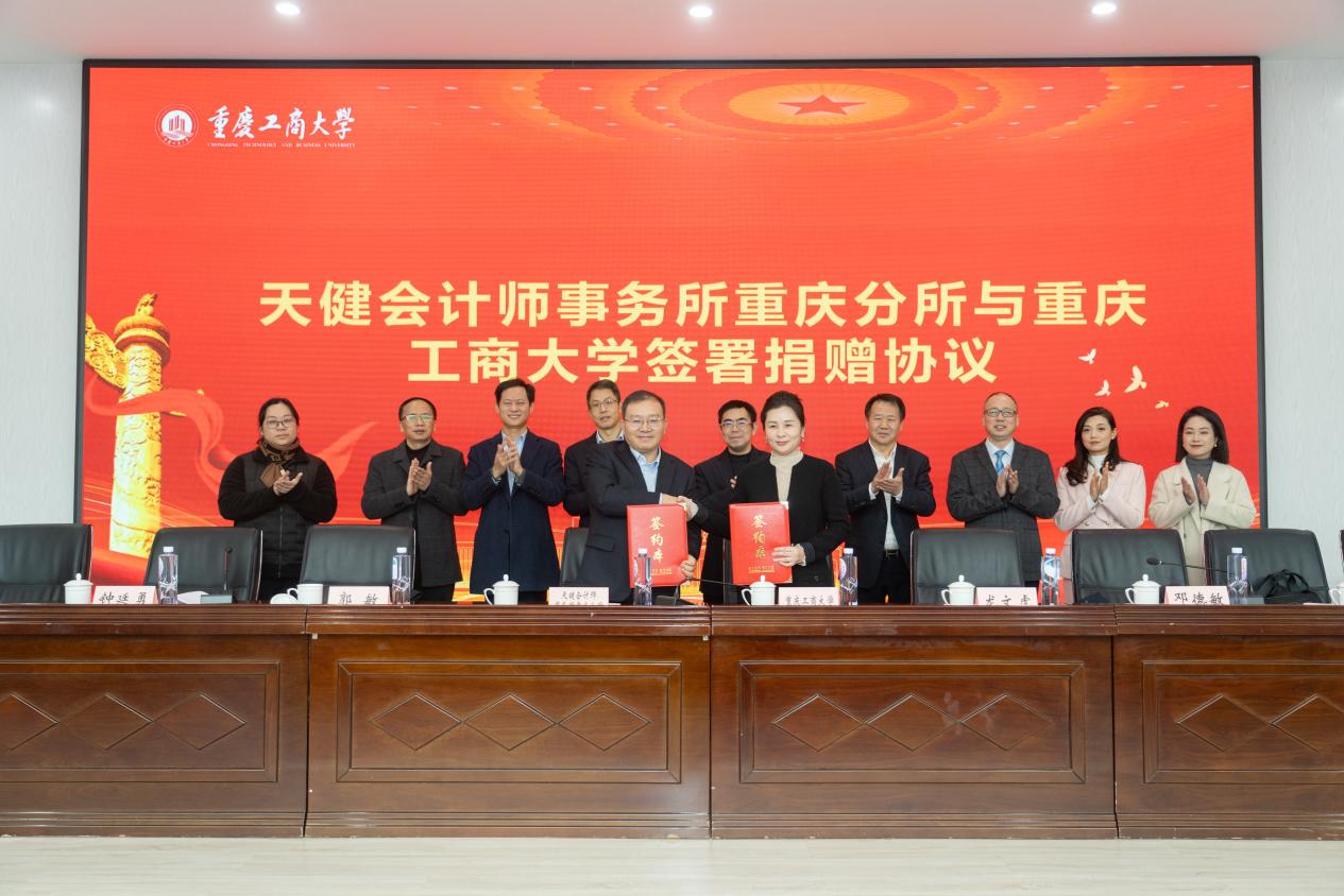 17318484270 2025年12月26日下午,重庆工商大学第五届“天健奖学金”颁奖典礼暨捐赠签约仪式在明德楼天健报告厅成功举办。重庆工商大学党委常委、副校长田双全,重庆工商大学国内合作发展处处长(校友办公室主任)郭敏和会计学院班子成员,天健会计师事务所副总裁、天健重庆党委书记龙文虎,天健会计师事务所副总裁、重庆分所总经理李青龙,天健会计师事务所高级合伙人、重庆分所副总经理潘理科,天健会计师事务所重庆分所人力资源总监许静,天健会计师事务所重庆分所人力资源经理廖小娅,获奖学生及师生代表100余人参加了活动。