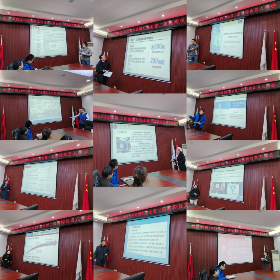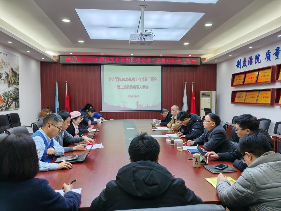 17318484270 1月14日上午,会计学院召开2025年度工作述职汇报会暨二级机构负责人例会,全体领导班子、二级机构负责人参加会议。会议由学院院长钟廷勇主持。