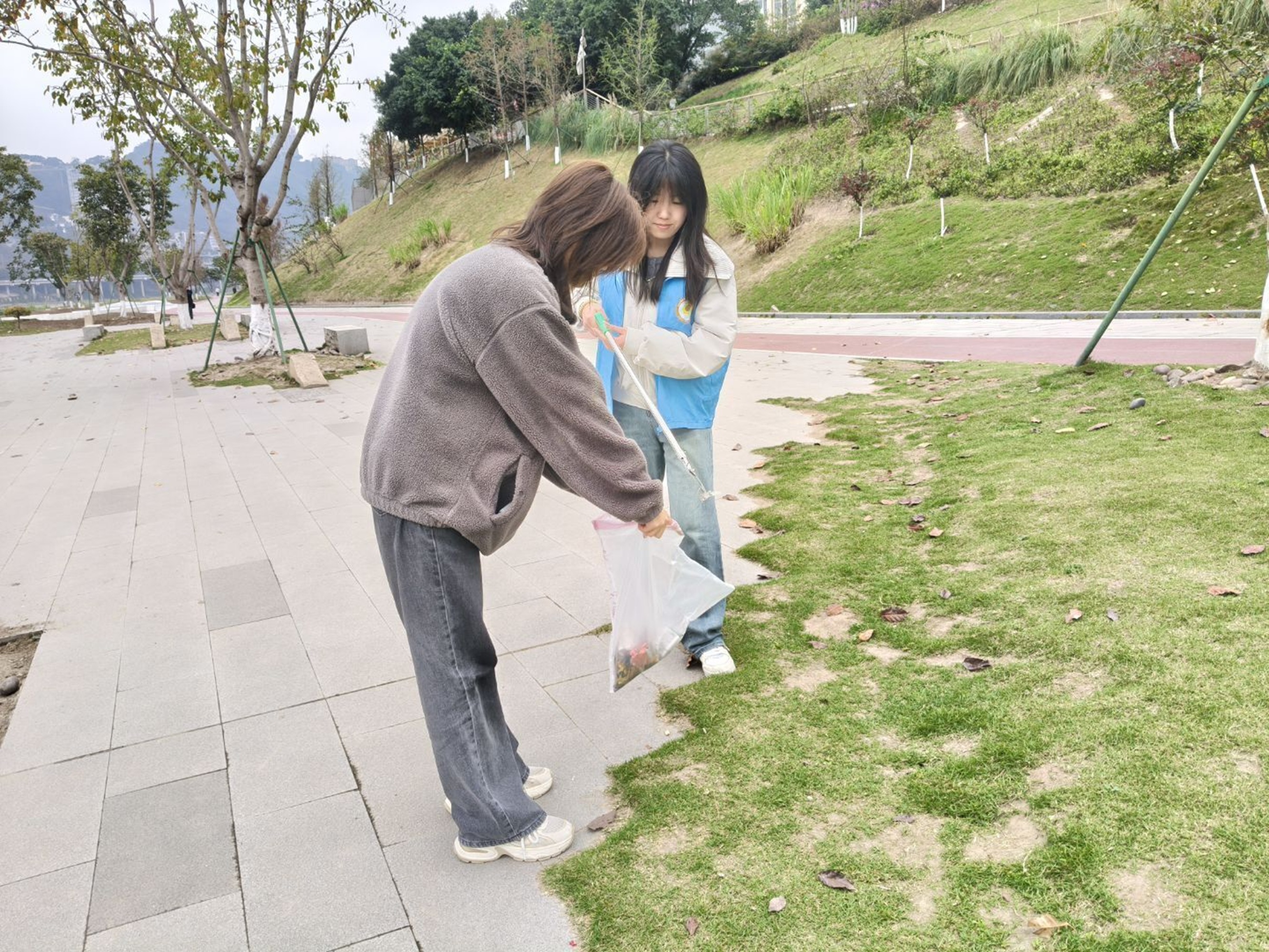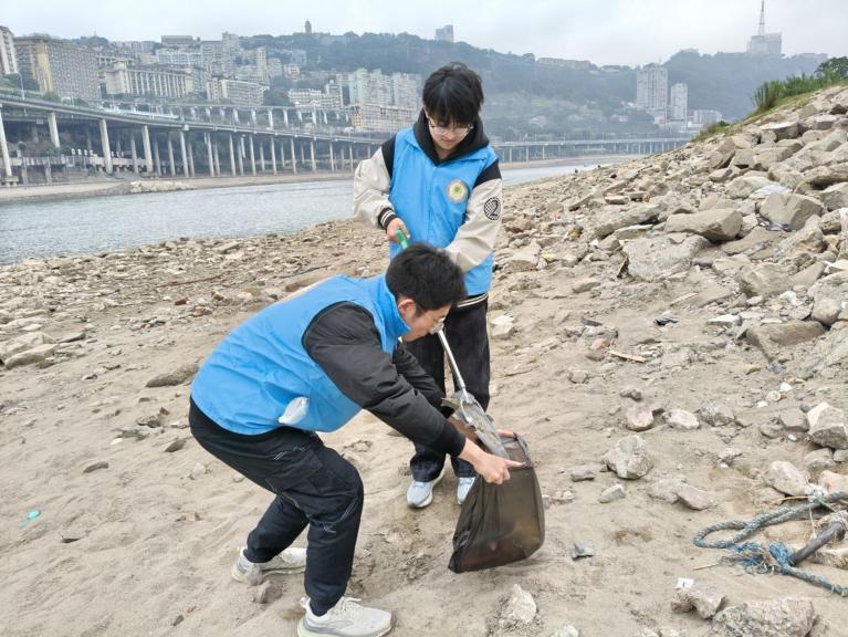活动当天,全体志愿者在重庆工商大学南岸校区西门准时集合,穿戴整齐志愿马甲后,在负责人的安全叮嘱下,有序前往活动地点。抵达目的地后,志愿者们迅速领取垃圾夹、垃圾袋、手套等清洁工具,在负责人的统一安排下以小组为单位划分责任区域,沿河岸沿线展开全面细致的净滩作业。大家分工明确、配合默契,弯腰俯身穿梭于河滩步道、绿化带、草丛石缝与临水边缘等卫生死角,不放过任何一处隐蔽垃圾,对塑料瓶、易拉罐、烟蒂、食品包装袋、废弃渔网、漂浮杂物等各类生活垃圾进行逐一捡拾、装袋。面对石缝深处、草丛底部难以清理的细小垃圾,志愿者们不怕脏、不怕累,或用垃圾夹细心勾取,或徒手小心捡拾,始终保持认真细致的态度。