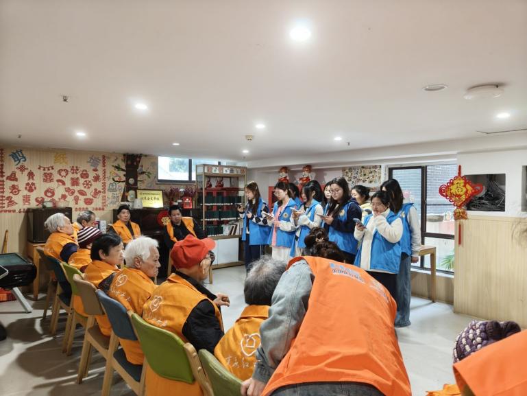 趣味互动过后,温情的文艺表演如约而至。志愿者们结合老人们的人生阅历与审美喜好,精心排练了《歌唱祖国》《难忘今宵》两首经典歌曲。熟悉的旋律响起,尘封的记忆被唤醒,温暖的歌声里,饱含着对祖国的热爱、对岁月的感怀,更藏着对老人们的美好祝福,温情与敬意在歌声中传递,让敬老院暖意融融 。