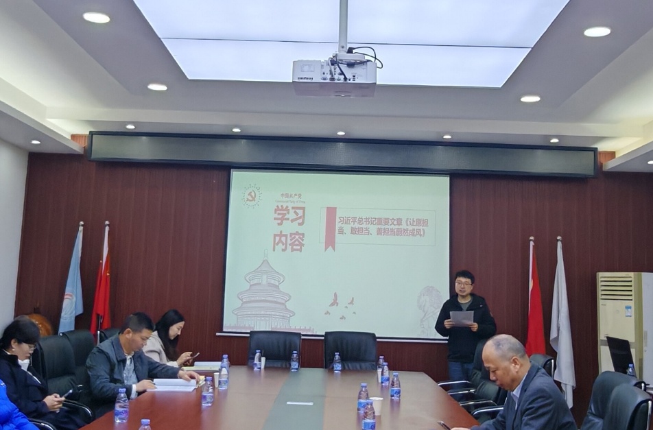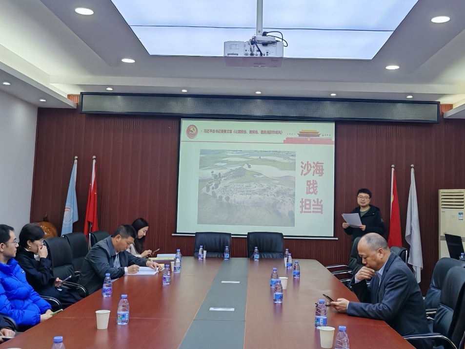 随后,支部开展了树立和践行正确政绩观学习教育。蒋弘领学了习近平总书记重要文章《让愿担当、敢担当、善担当蔚然成风》,并结合学习内容,为大家带来了一堂题为《沙海践担当》的微党课。党课深情讲述了“人民楷模”中共党员王有德同志四十年如一日,带领职工在毛乌素沙漠治沙播绿、创造绿色奇迹的感人事迹,生动诠释了“愿担当、敢担当、善担当”的深刻内涵。