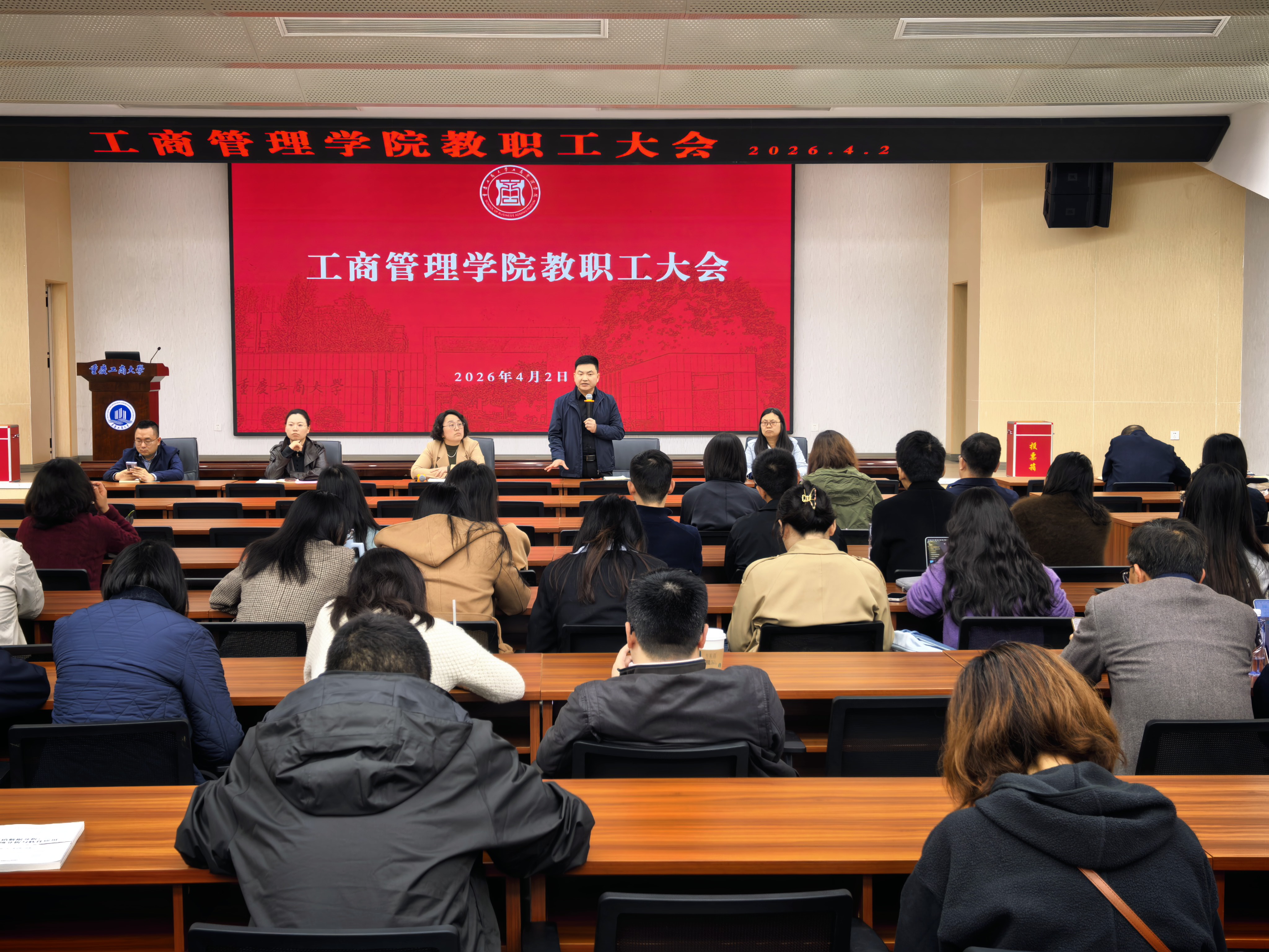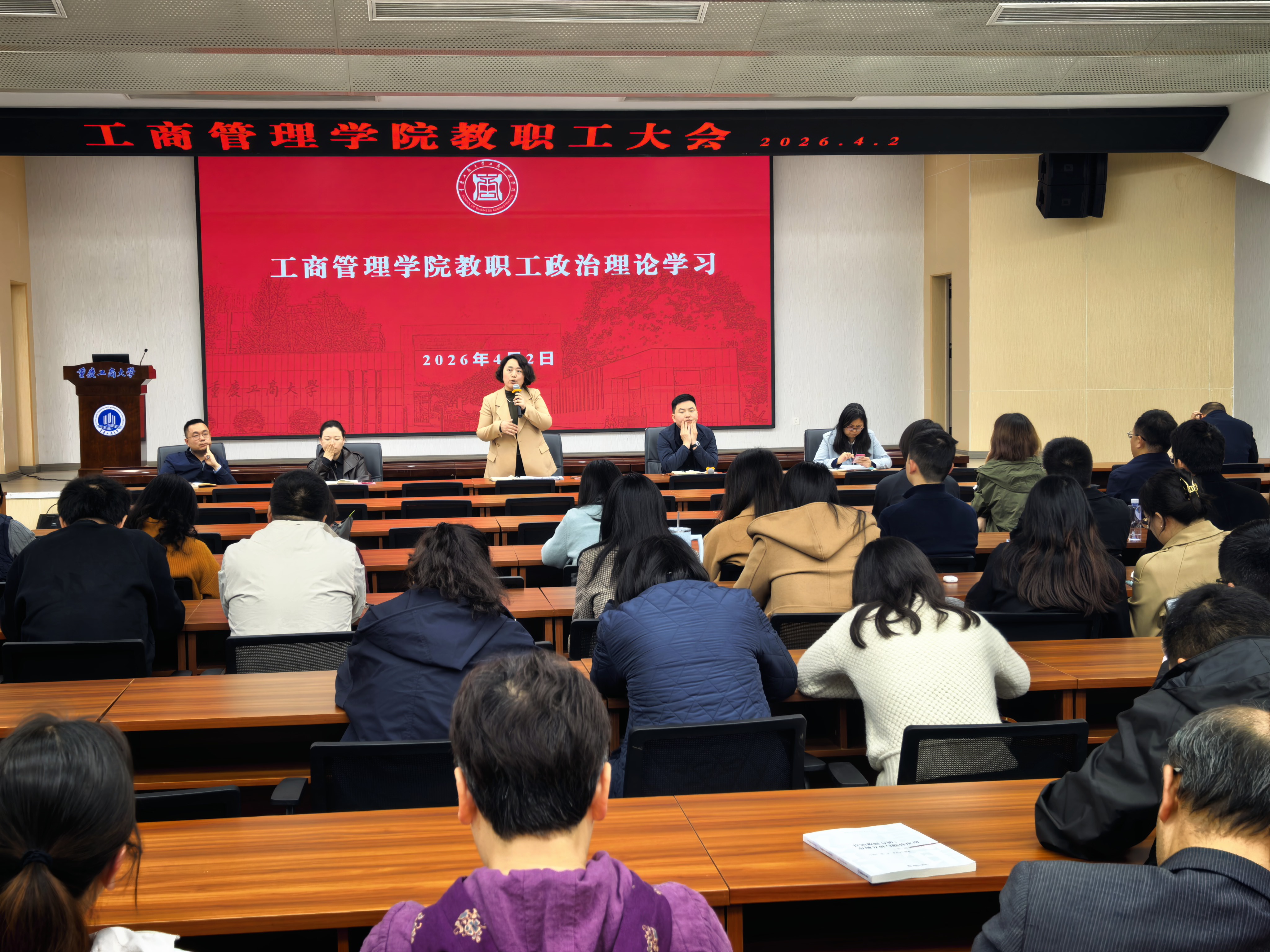 为强化理论武装、严明纪律规矩、统筹推进学院各项事业高质量发展,4 月 2 日,工商管理学院在明德楼 1019 会议室召开教职工大会暨政治理论学习会。学院全体教职工参加会议。