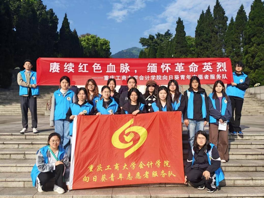 17318484270 又是一年清明至,缅怀先烈寄哀思。为深入学习贯彻党的二十大精神,践行习近平总书记关于崇尚英雄、缅怀英烈、传承红色基因的重要论述,引导青年学子铭记历史、厚植爱国情怀,2026年4月4日,重庆工商大学会计学院向日葵青年志愿者服务队前往重庆市沙坪坝区歌乐山烈士陵园,开展“赓续红色血脉,缅怀革命英烈”清明祭扫活动,在庄重仪式中缅怀革命先烈不朽功勋,从红色精神中汲取奋进力量。