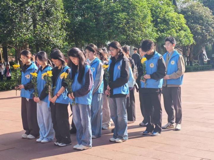 活动当天,参与活动的志愿者分校区准时集合,有序前往歌乐山烈士陵园。上午8时30分,祭扫活动正式开始。苍松翠柏环绕,庄严肃穆的陵园内,革命先烈的英雄事迹,早已在大家心中树立起不朽的精神丰碑。全体成员身着素净服装,心怀崇敬之情,齐声朗诵烈士赞歌,用真挚词句缅怀英烈壮举;随后全场默哀一分钟,低头追思,向为民族独立、为人民解放献身的革命先烈致以最深切的缅怀。在主持人的带领下,全体学子面向烈士纪念碑庄严宣誓,铿锵有力的誓言在陵园上空回荡,彰显出新时代青年传承红色基因、勇担时代使命的坚定决心。宣誓完毕,同学们手持金黄菊花,缓步走向纪念碑,轻轻献上花束,依次绕碑瞻仰,以朴素而庄重的方式寄托对英烈的无限哀思。最后,全体成员合影留念,定格下此次庄重的缅怀时刻。