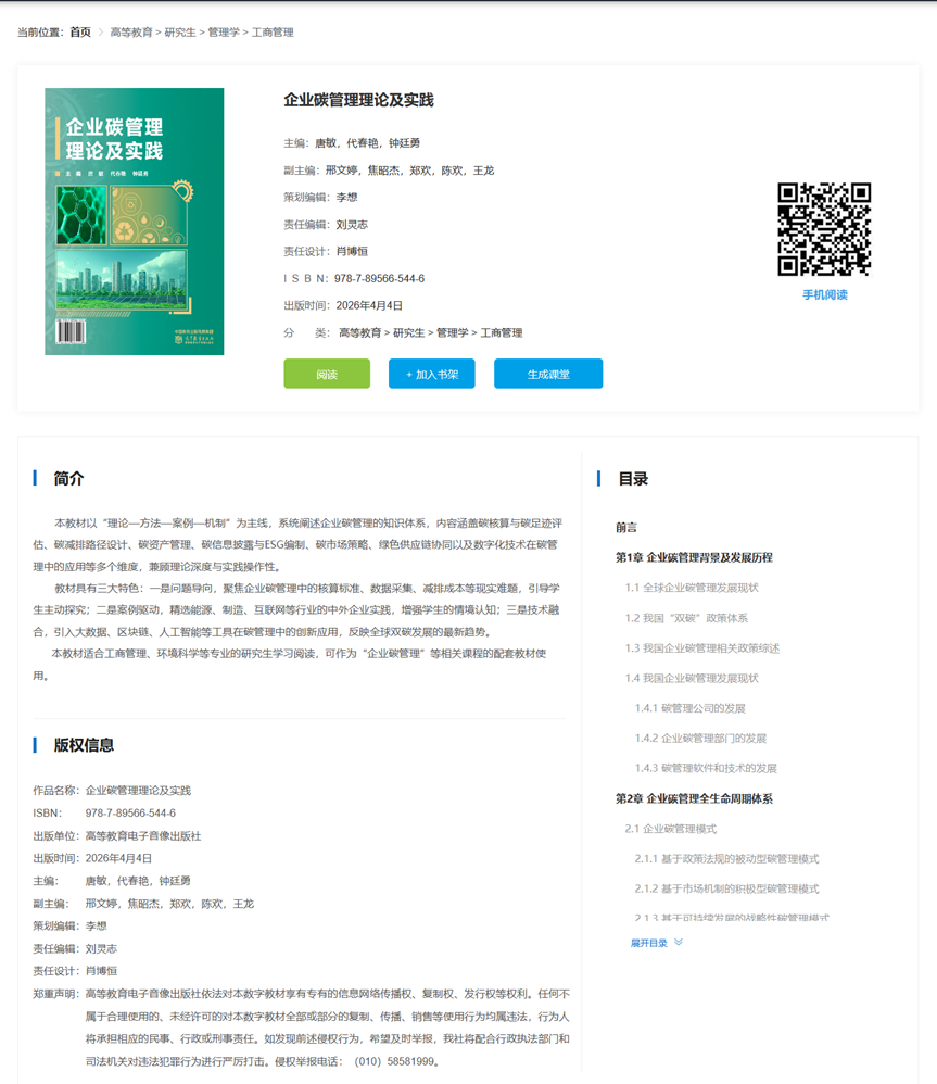 17318484270 近日,由我院唐敏老师领衔主编的教材《企业碳管理理论及实践》在高等教育出版社数字教材平台正式上线,标志着我院在践行“大商科+新工科”助力重庆“33618”现代制造业形成新质生产力方面取得了新的进展。