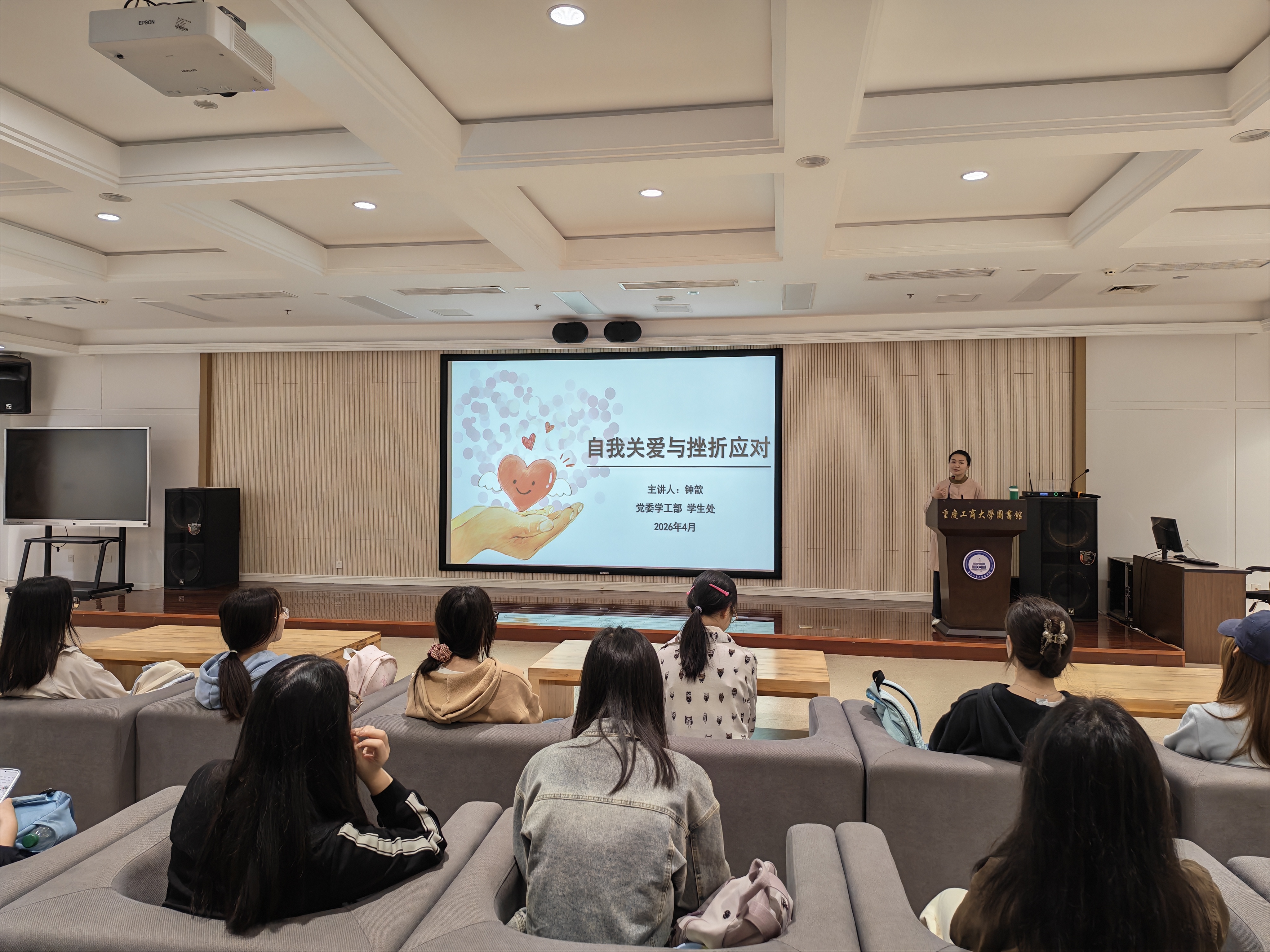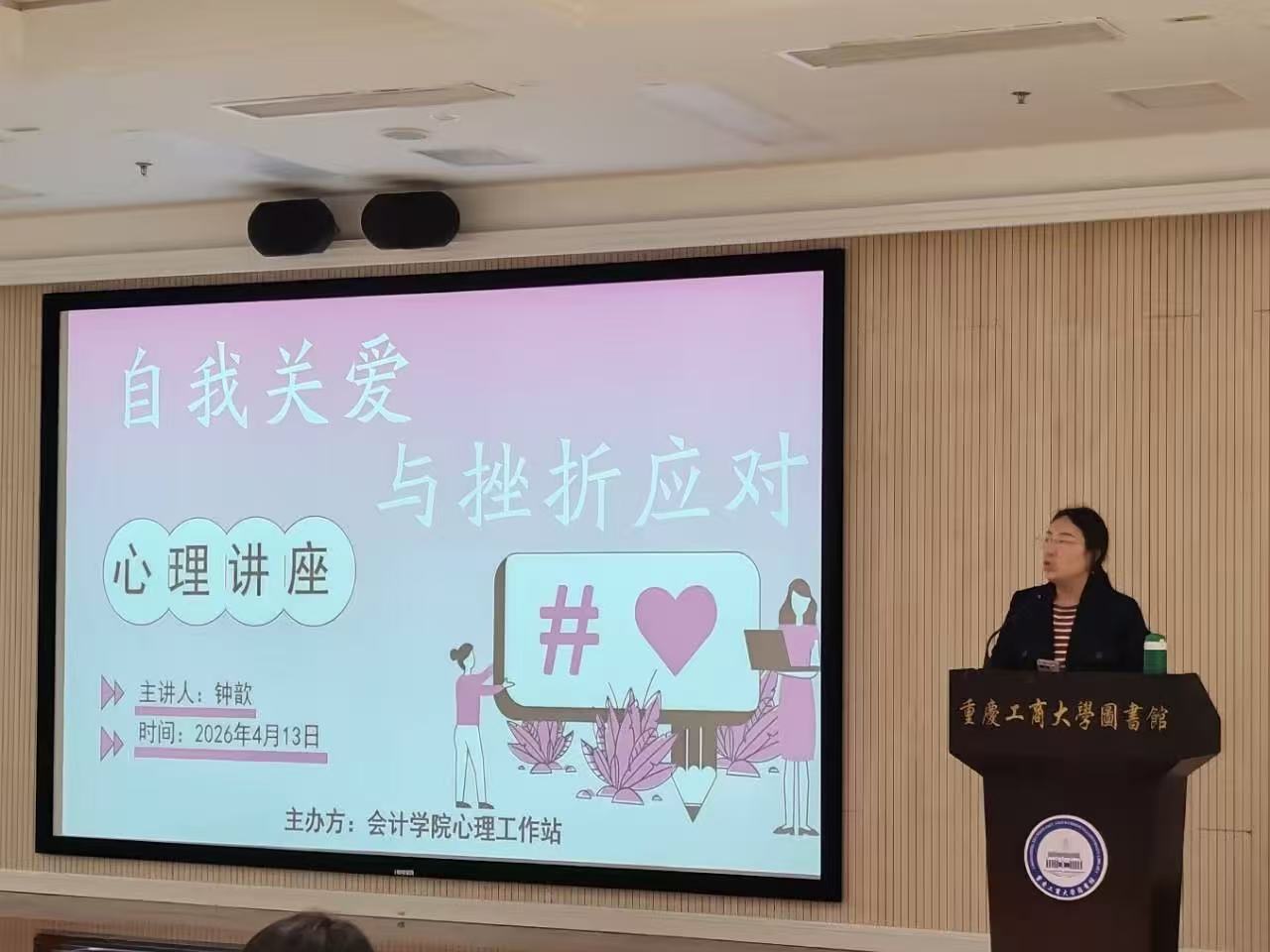 17318484270 为深入推进大学生心理健康教育工作,引导学生提升心理韧性、掌握自我关爱的能力与应对挫折的方法,2026年4月13日中午,会计学院心理工作站在南岸校区图书馆视听预览室成功举办了“自我关爱与挫折应对”心理主题讲座。本次讲座特邀学校心理健康教育与咨询中心专职教师钟歆副教授担任主讲,会计学院陈曦老师出席并作开场致辞,吸引了众多学生到场聆听学习。